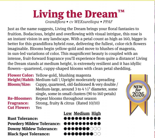 Perfect for cutting gardens, borders, or as a showpiece in mixed beds, Living the Dream™ offers not only stunning color but excellent disease resistance and long-lasting performance. Whether you're gifting inspiration or enhancing your personal sanctuary, this rose embodies joy, strength, and timeless elegance. Zone- 5-9