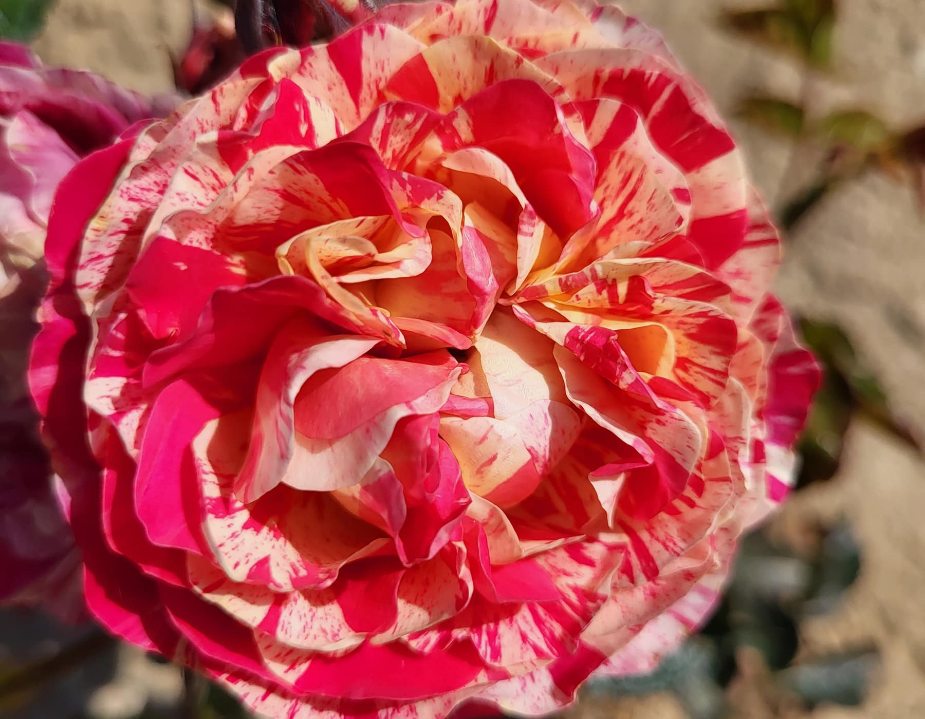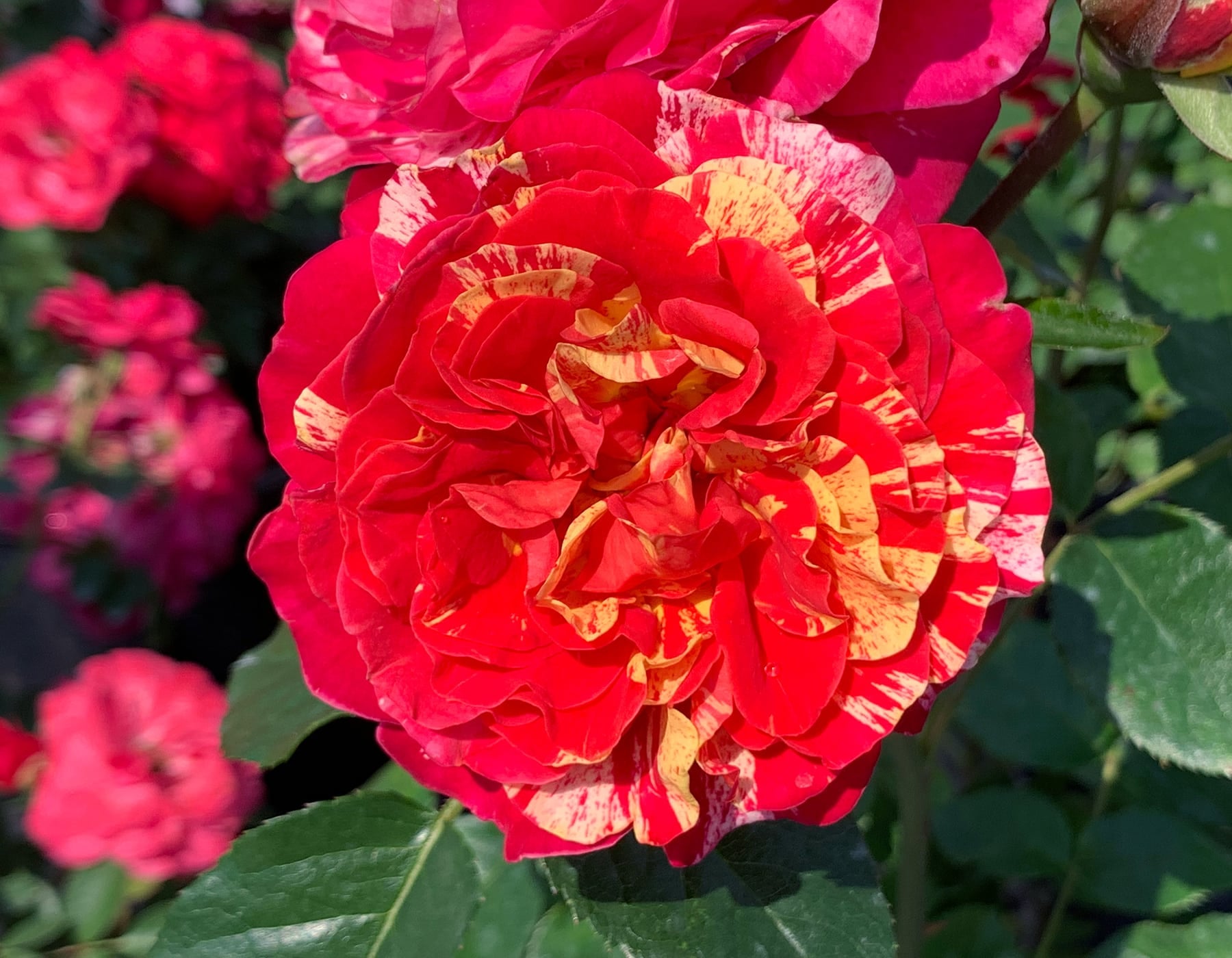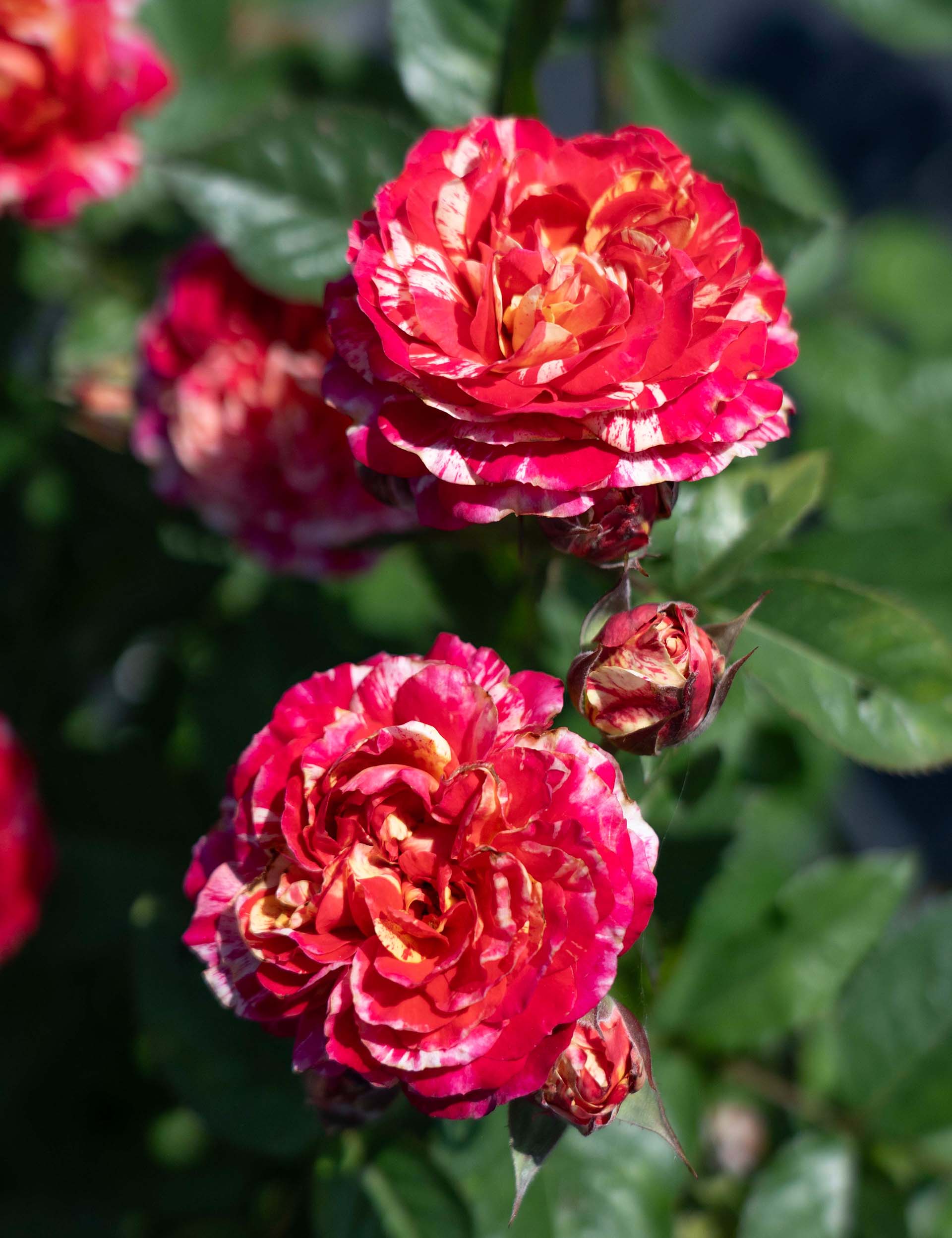 Earning your stripes is easy with this rose: just plant and enjoy! Each bloom offers a spectacular palette of cherry red and fuchsia petals striped with yellow. A compact and vigorous Floribunda.